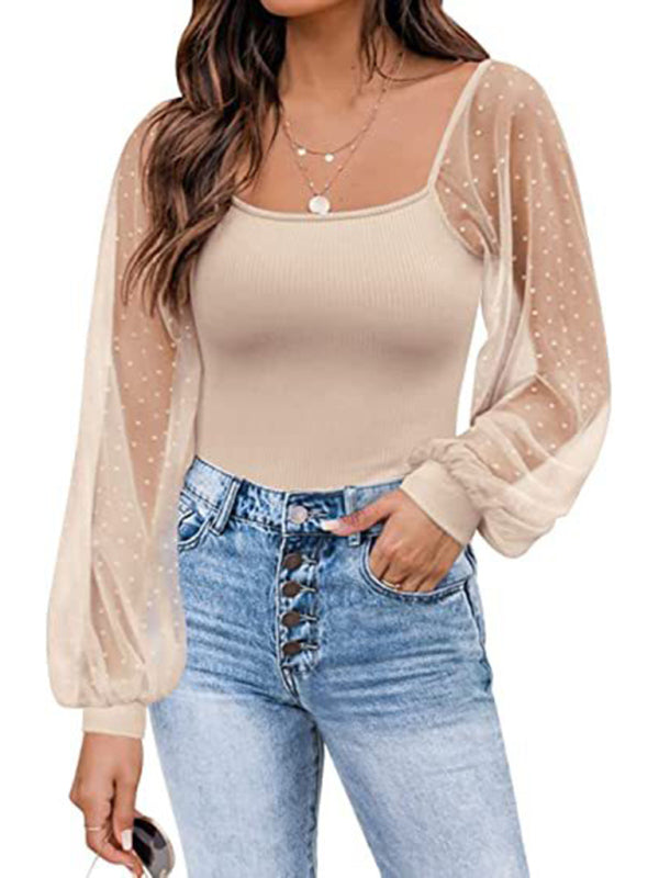 Ada New Ladies Fashion Perspective Lantern Sleeve Stitching Slim Top