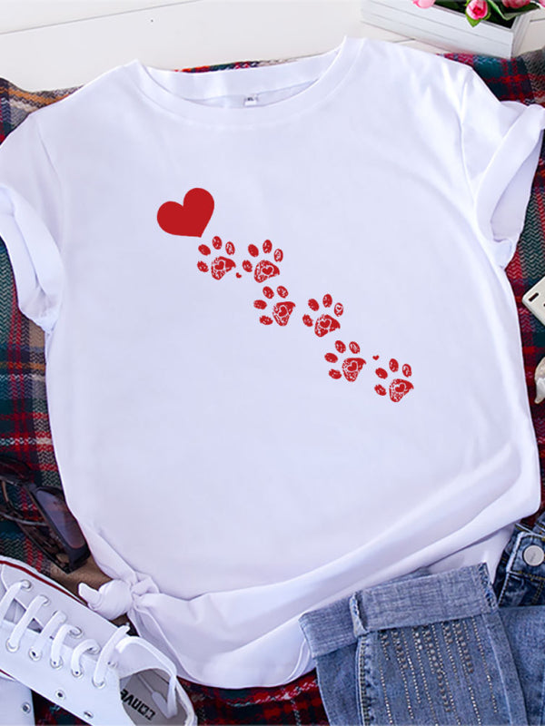 Denise New Women's Casual Love Animal Footprint Casual Cotton Short-Sleeved T-Shirt