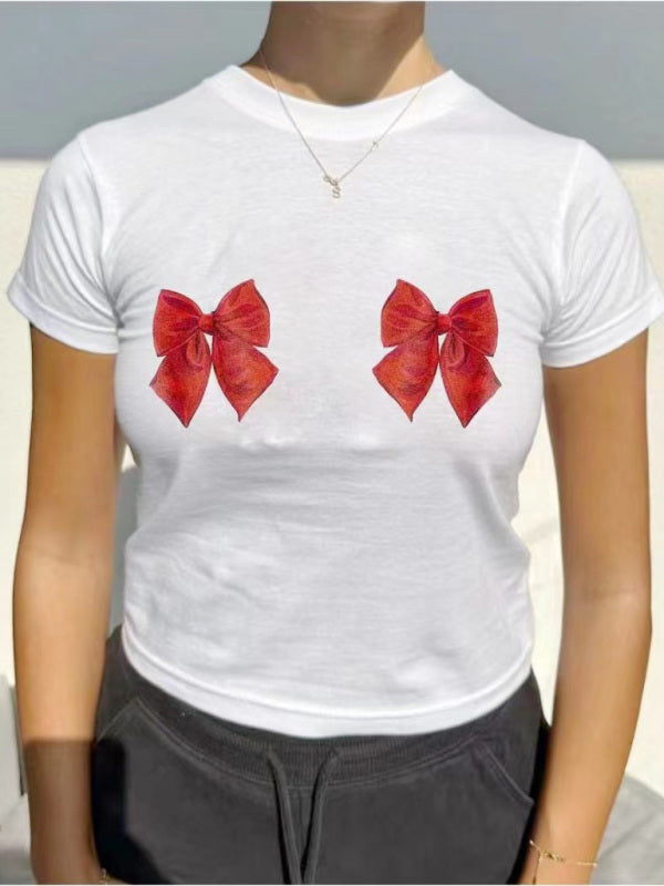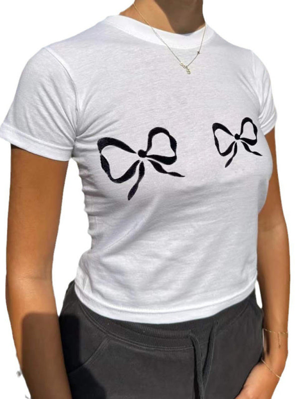 Ella New Short-Sleeved Street Solid Color Bow Print Round Neck Casual T-Shirt