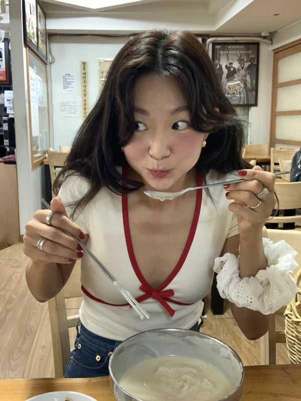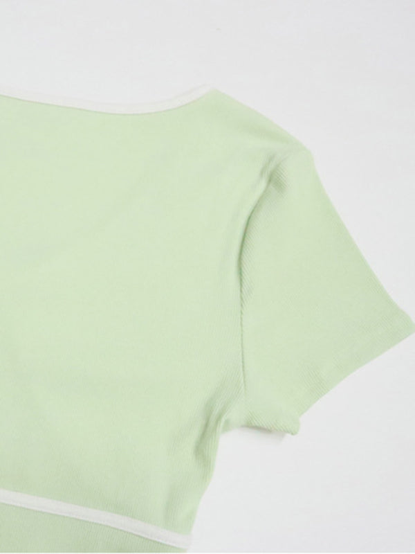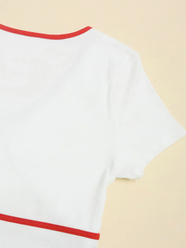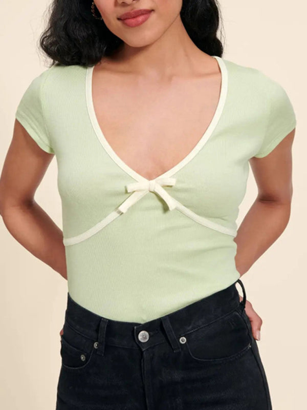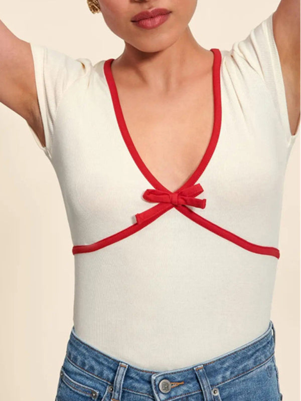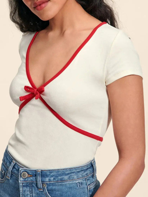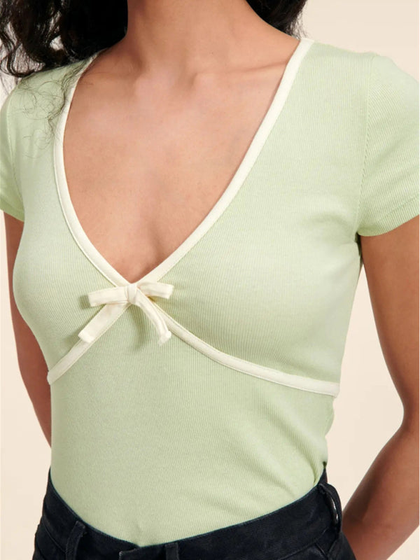 Katrina Women's New Solid Color Deep V Contrast Color Slim Fit Pure Cotton Knitted T-Shirt
