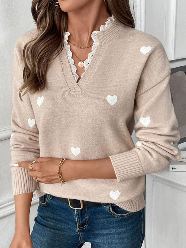 Miracle Love Round Neck Sweater New Valentine's Day V-Neck Splicing Lace Pullover Sweater